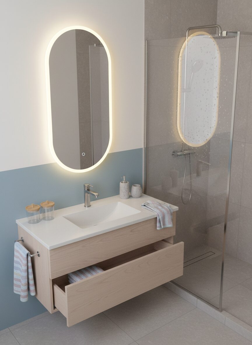 In addition, thanks to the ‘Memory’ function, so that the mirror remembers the last colour and intensity settings.